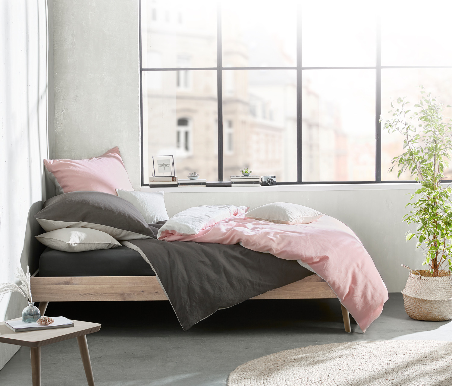 Solid color reversible bedding with lightly textured linen-cotton fabric in crash look. Closure by zipper. Set consists of a duvet cover and pillow cover. Grab quickly at our new spring collection - limited offer only while stocks last!