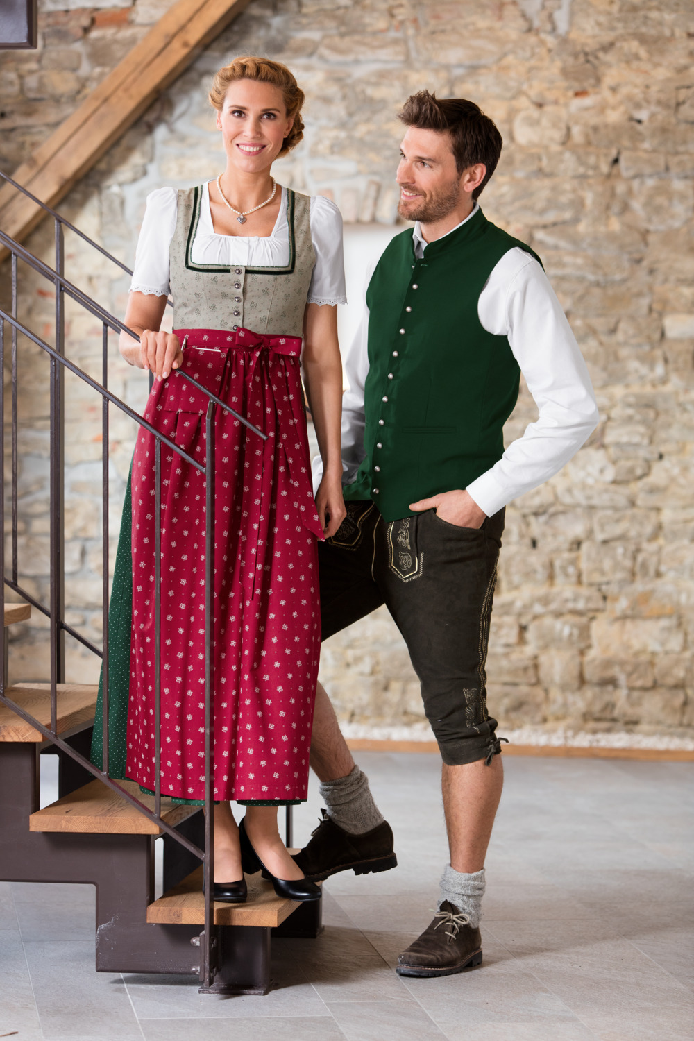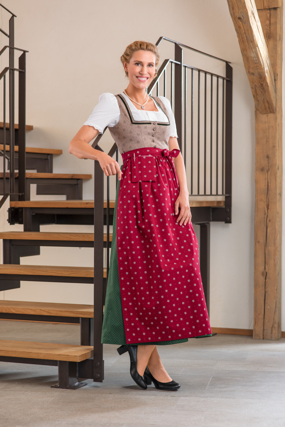 Long-length dirndl with taupe-colored upper part made from washable hunter's linen with a subtle floral print, plus a dark-green spotted skirt and floral apron in burgundy. Neckline with narrow dark-green piping and matching velvet appliqué all the way round. Shaping seams in the upper part, fastened using elegant metal buttons on the front. Practical and detachable two-part pocket on the dirndl apron. Supplied with an apron. Upper fabric 55% cotton/45% linen, skirt 100% cotton, lining 65% polyester/35% cotton, apron 100% cotton