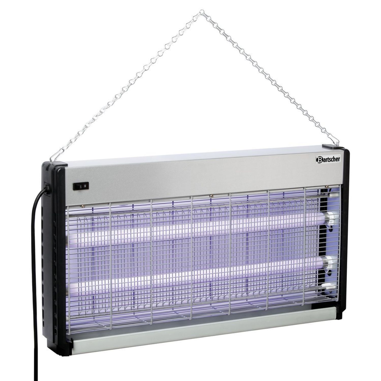 Insect killer made of plastic housing. Can be used as a ceiling-mounted or floor-mounted unit. Destroy without chemicals: The grid attracts the insects by neon lights. At the electrically charged inner grid the insects are killed immediately. The device has an easily removable drawer with cleaning brush, two neon lights, and an on/off switch. Suitable for continuous operation. Two-year warranty. Connected load 45 W/230 V, effective radius 12m, grid voltage 2500 V, light source 2x20 W, weight 3.7 kg.