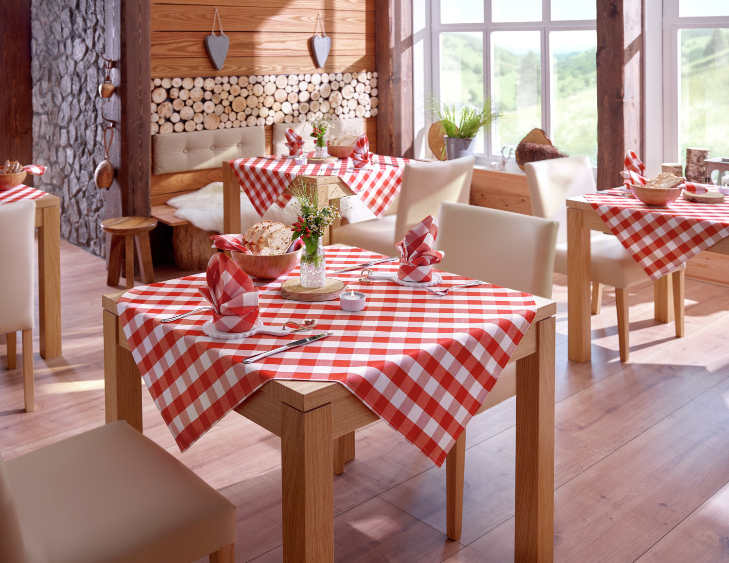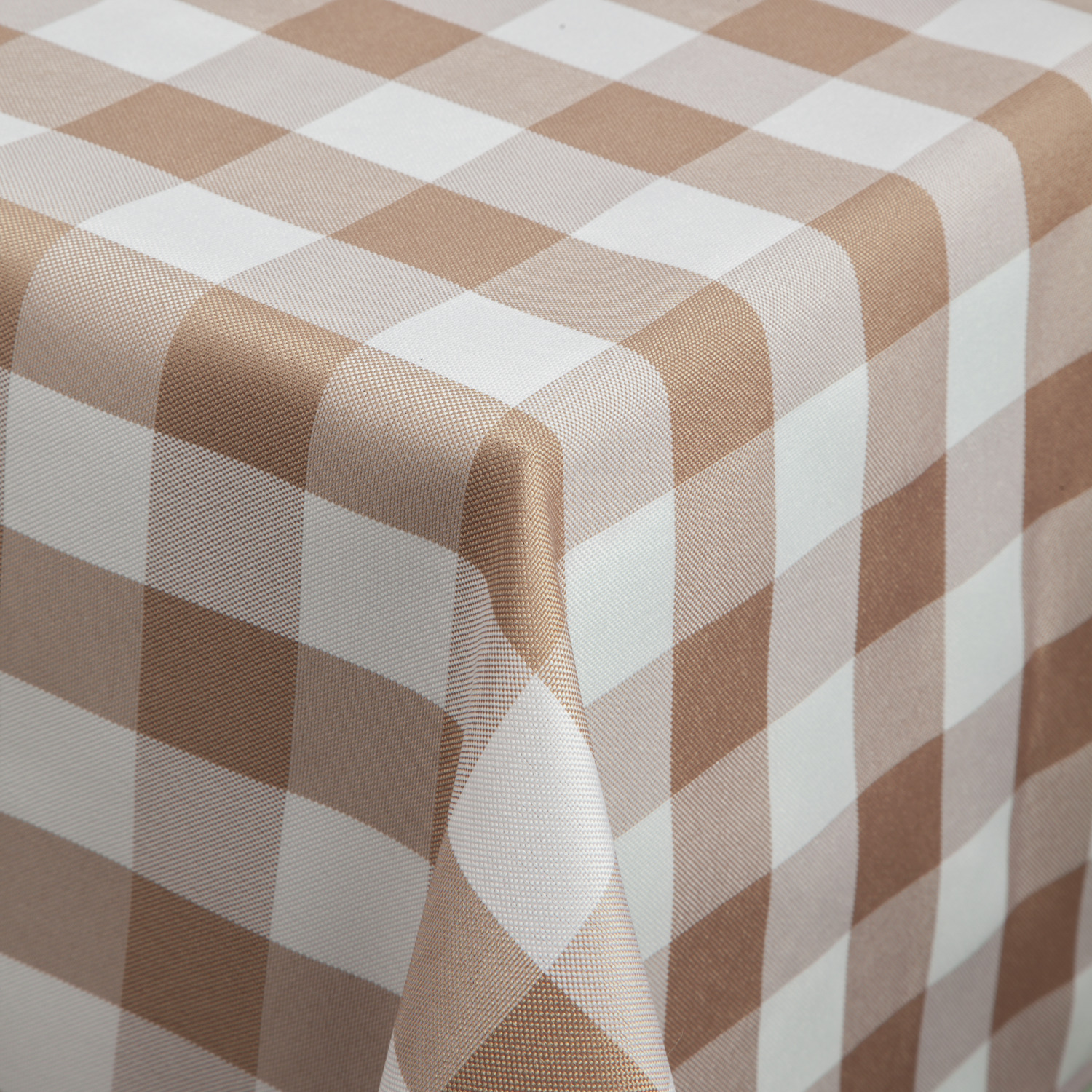100% polyester. Weight approx. 210 g/m². Rustic tablecloth with check pattern. High lightfastness. Suitable for indoor and protected outdoor use. Particularly easy to clean, durable, quick drying and easy to iron. Personalization possible.