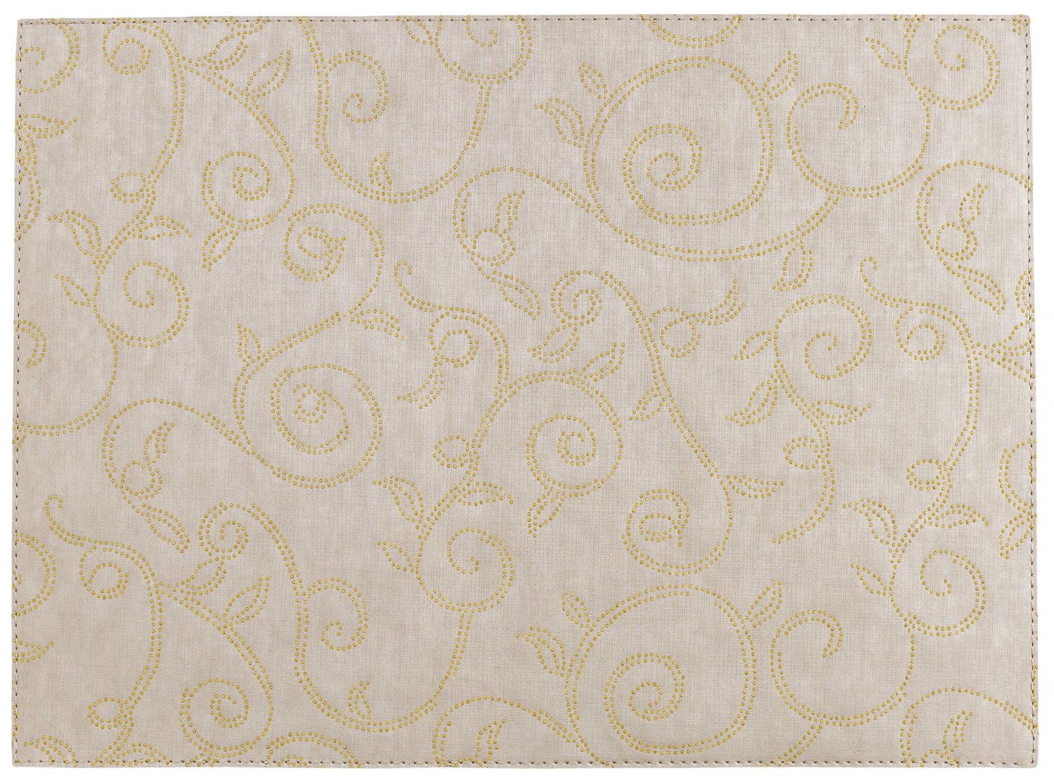 100% polyurethane (1150 g/m²). Placemat made of 100% imitation leather with floral tendril pattern. Can be wiped clean with a damp cloth. Not dishwasher safe. Not suitable for outdoor use.
