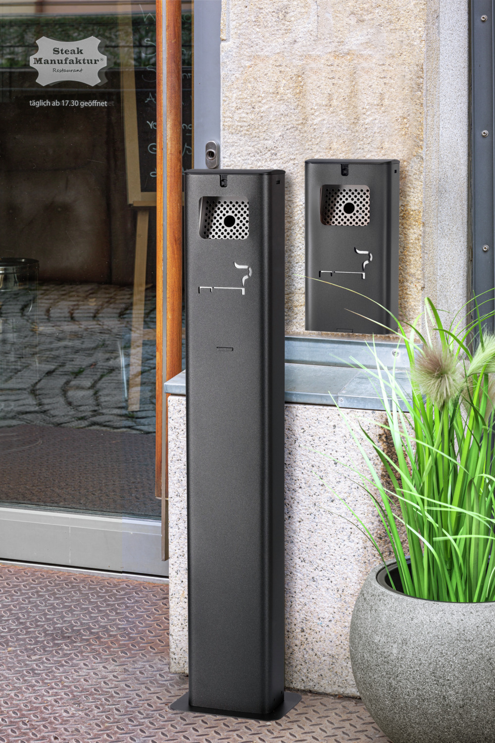The simple standing ashtray is made of galvanized, powder-coated steel and is suitable for outdoor use. Easy emptying by removal. Capacity of 2.5 l. Lockable lid. Incl. key and fastening material.