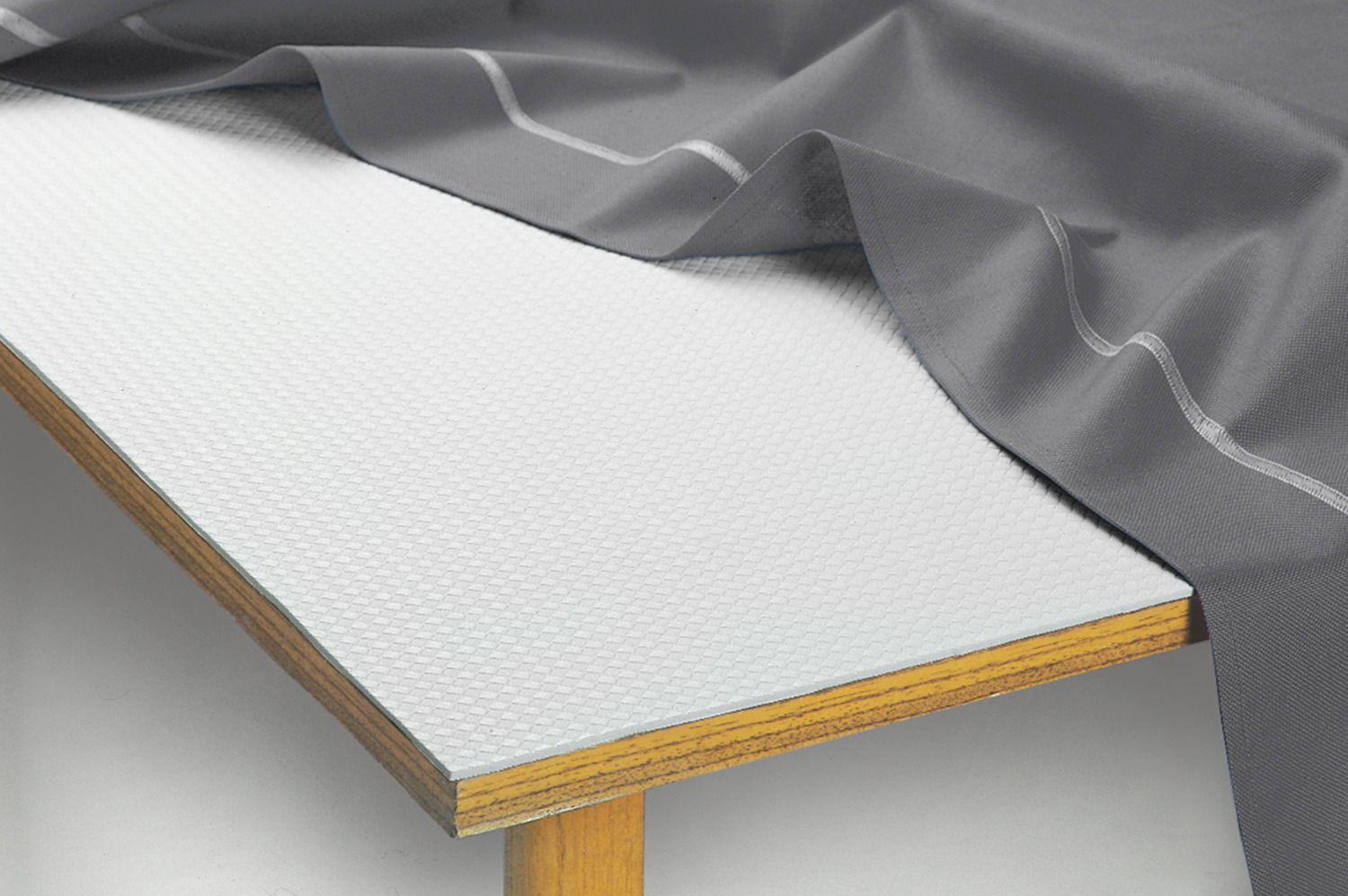 100% polyester. Weight approx. 570 g/m². Non-slip table protector made of polyester fabric, foamed on both sides with soft PVC. No rattling of dishes, protects table from damage. Damp wipeable. Available by the meter. Easy to cut to desired size, does not need to be hemmed. Max. roll length: 15 meters.