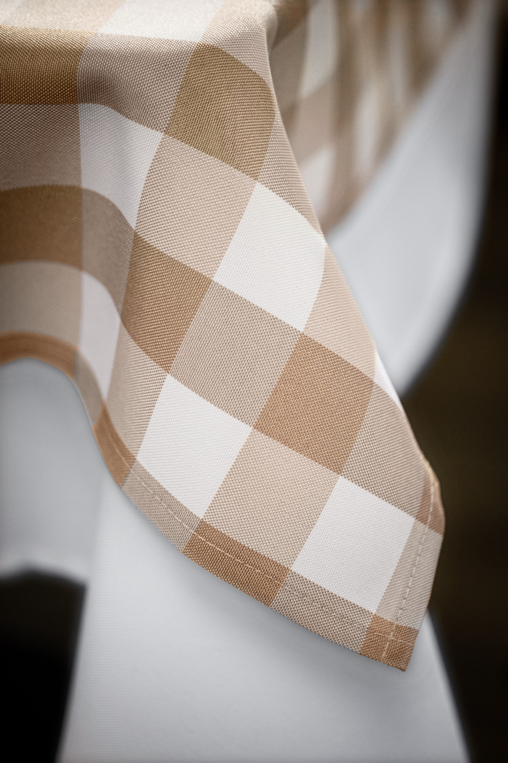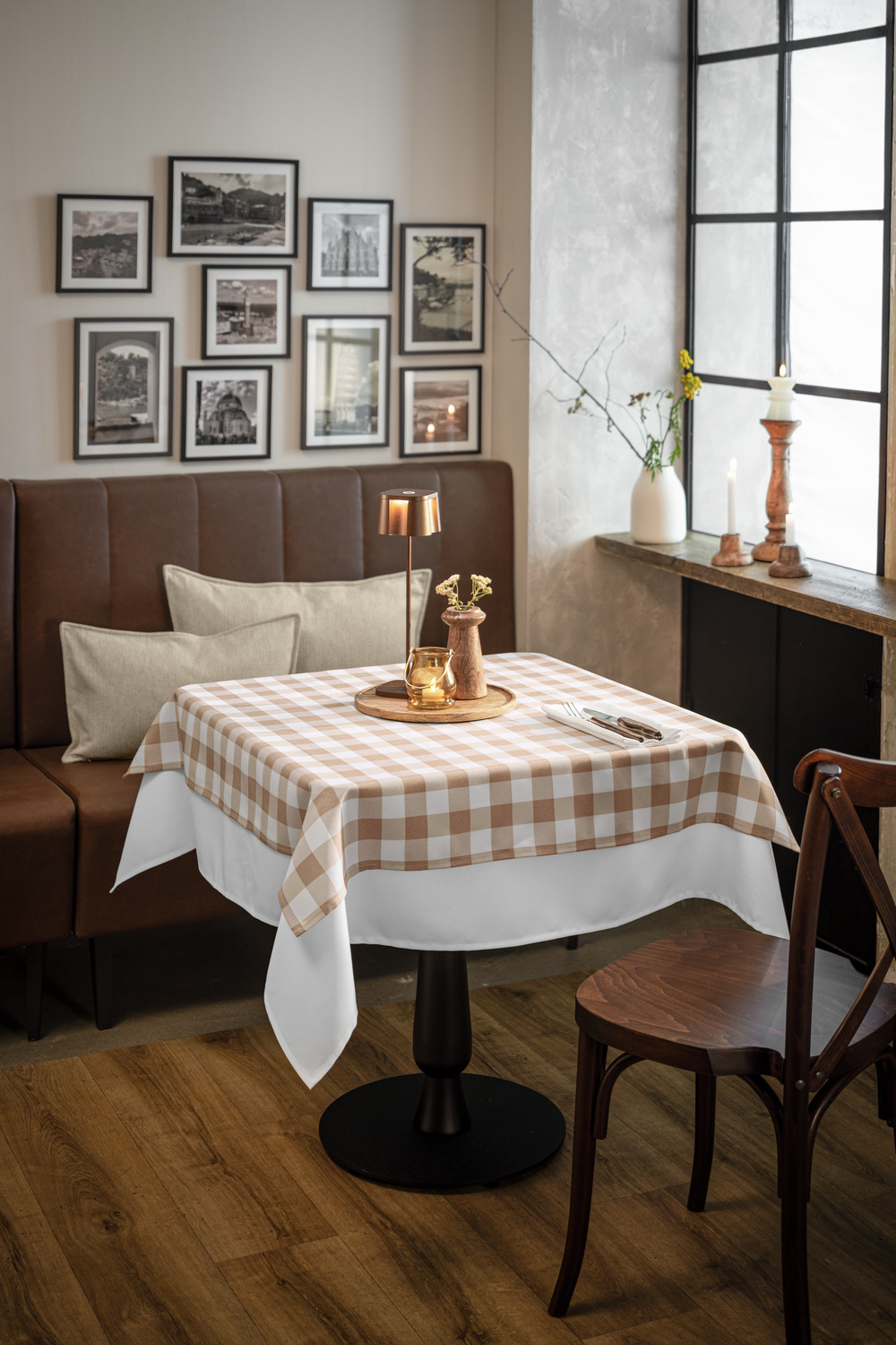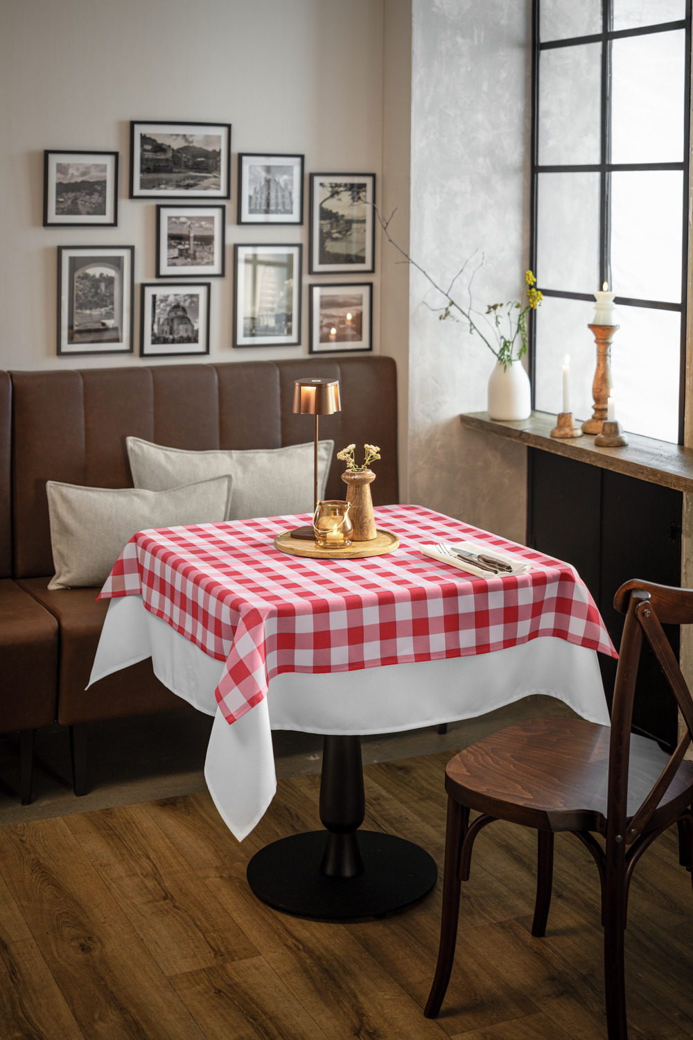 100% polyester. Weight approx. 210 g/m². Rustic tablecloth with check pattern. High lightfastness. Suitable for indoor and protected outdoor use. Particularly easy to clean, durable, quick drying and easy to iron. Personalization possible.