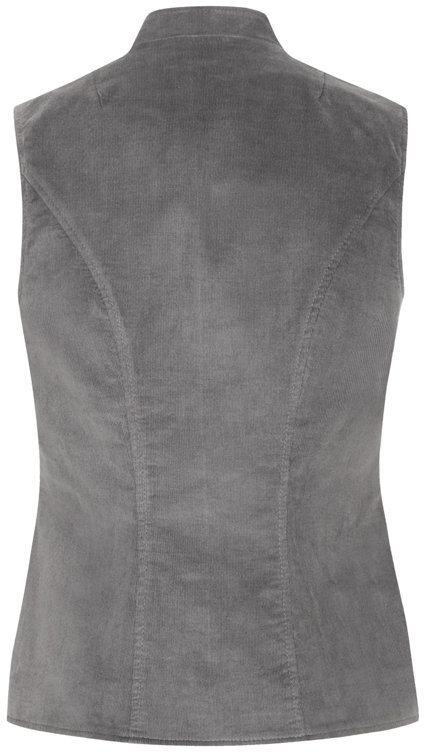 Classic, waisted women's vest with high collar. Women's vest with 2 piping pockets, metal button closure with glitter stone insert and darts in the front and back part. Material cord: 100% cotton. 30° wash.