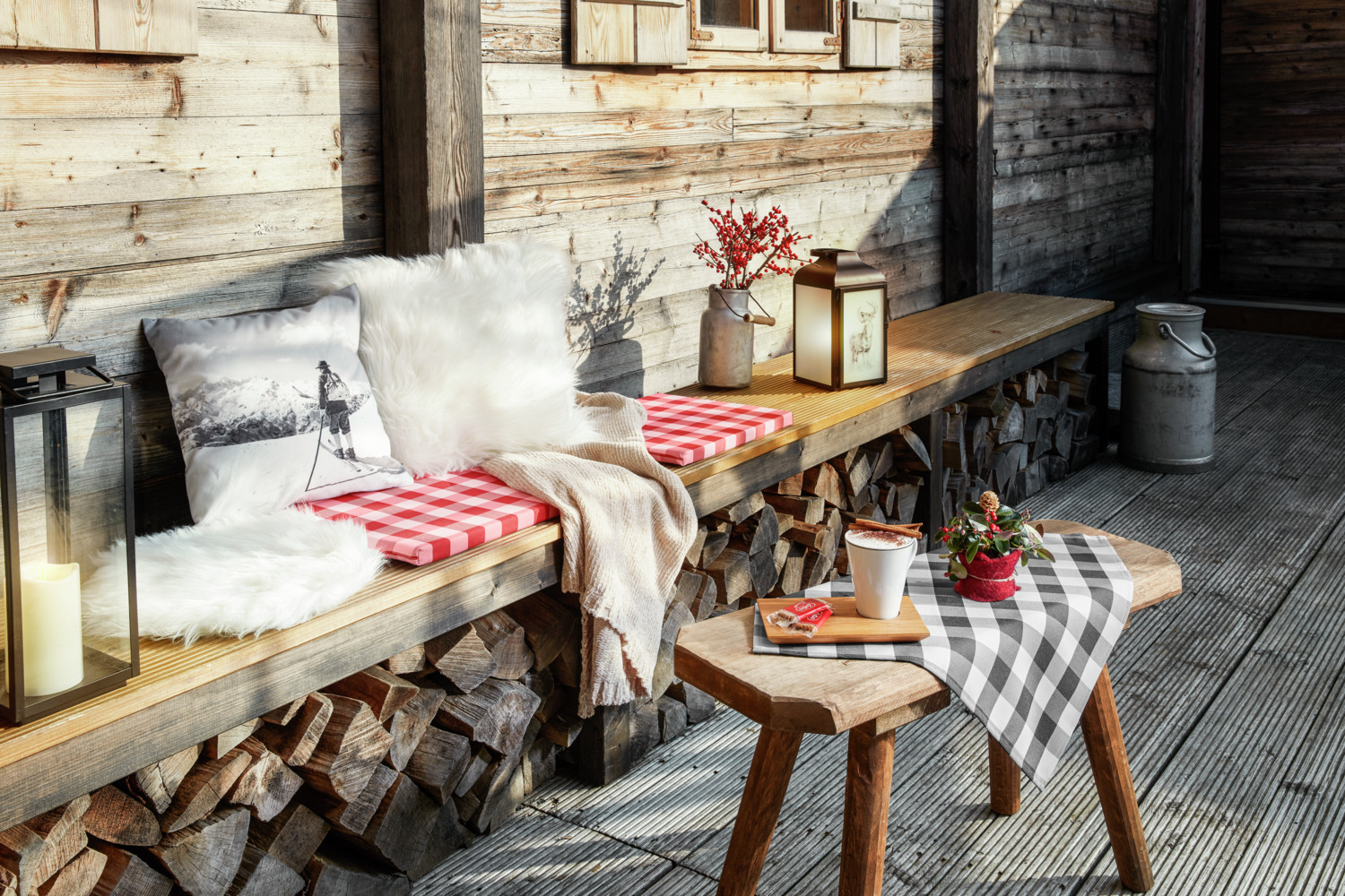 100% πολυεστέρας, ημι-στριμμένο. Βάρος περίπου 210 g/m². Άνετα μαξιλάρια καθίσματος με ρουστίκ καρό μοτίβο. Κατάλληλα για εσωτερική και εξωτερική χρήση. Με φερμουάρ για εύκολο κάλυμμα. Εύκολα καθαρίζονται, ανθεκτικά.