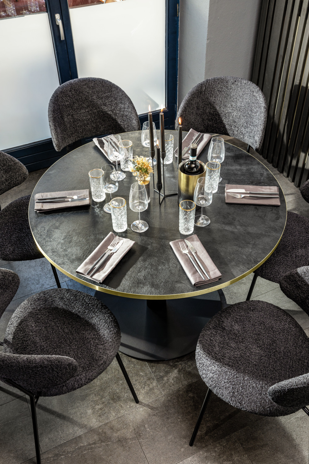 Κομψή καρέκλα με ταπετσαρία με μοντέρνο υφασμάτινο κάλυμμα (100% πολυεστέρας) και σκελετό από βαμμένο ατσάλι. Εργονομικό κάθισμα. Κατάλληλη μόνο για χρήση σε εσωτερικούς χώρους. Παραδίδεται συναρμολογημένη.