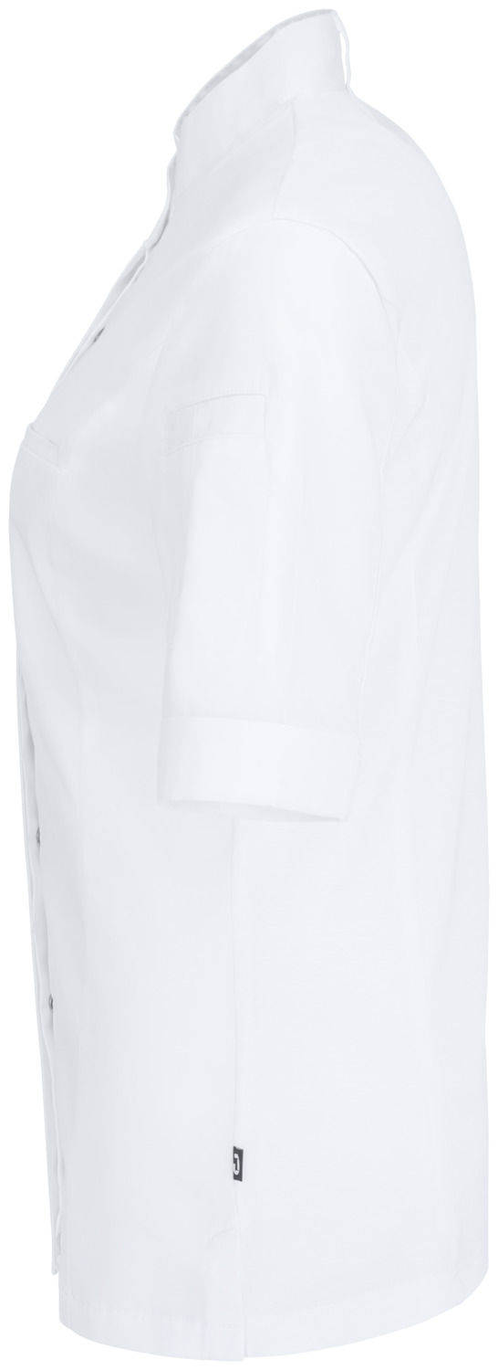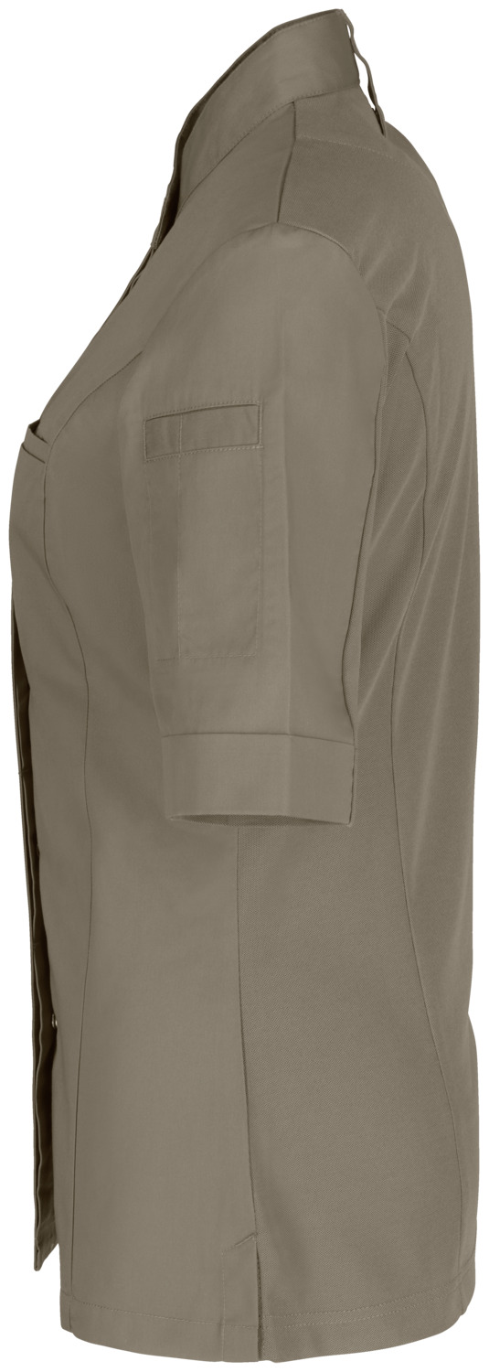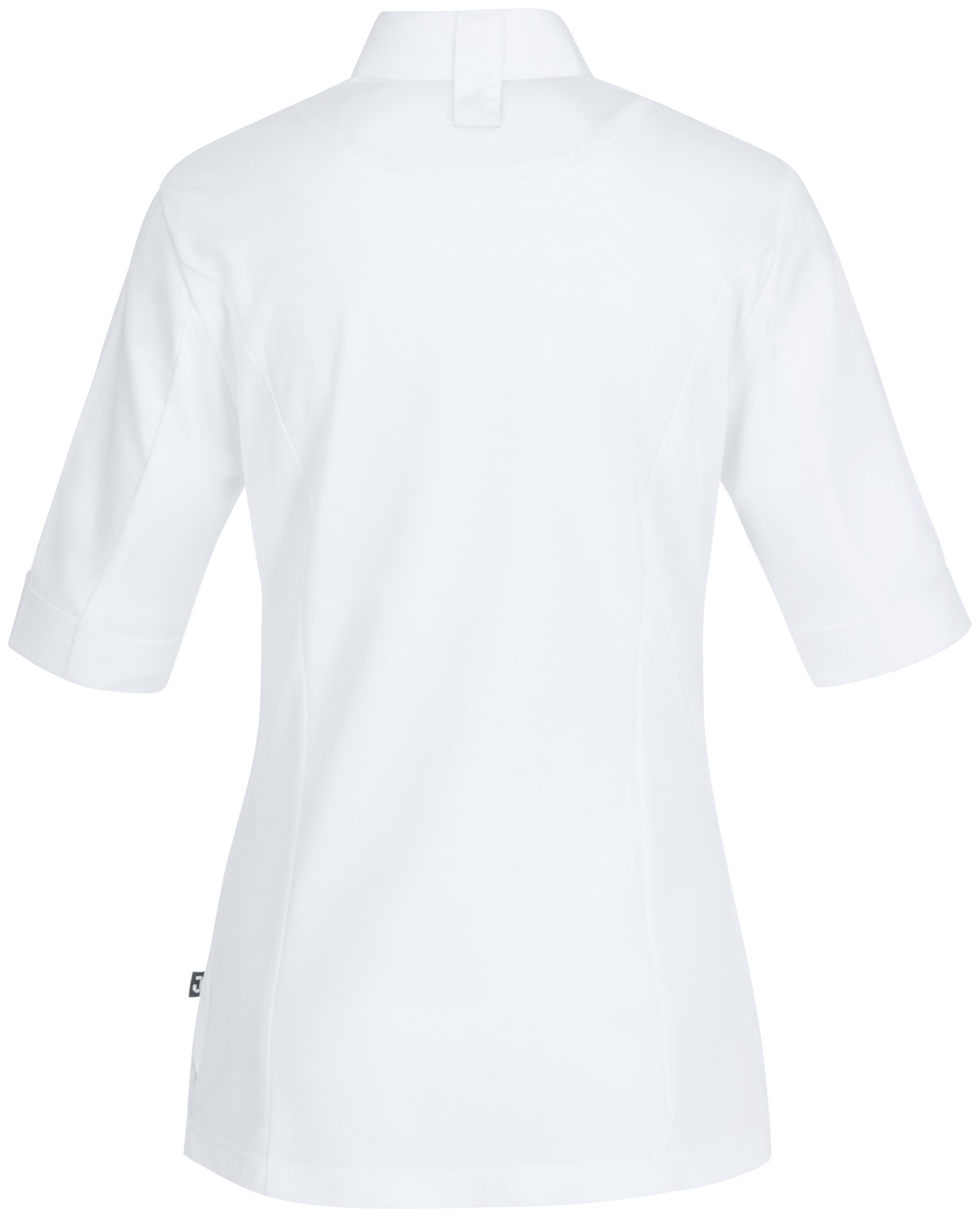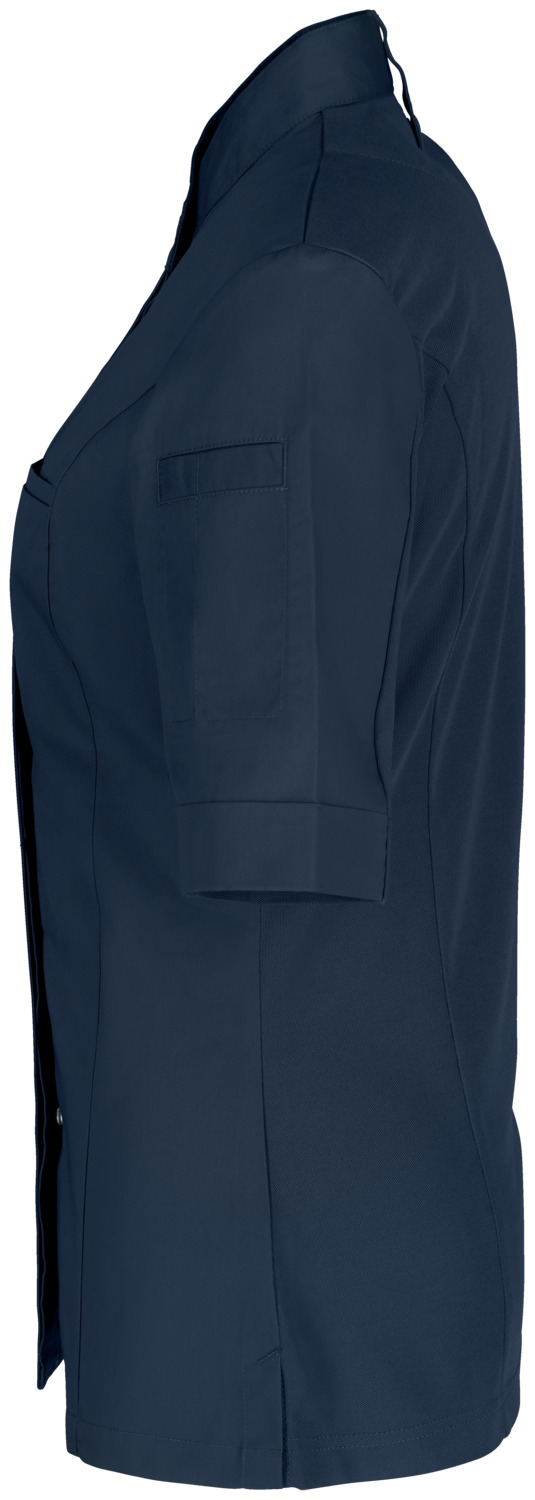 65% πολυεστέρας, 35% βαμβάκι. 150 g/m². Πλύσιμο στους 60°C Κομψό γυναικείο σακάκι σεφ με κοντά μανίκια, από πολύ ελαφρύ και διαπνέον ύφασμα. Με ανασηκωμένο γιακά και κρυφή τρέσα με κουμπιά, καθώς και τσέπη 2 τμημάτων στο πάνω μέρος του βραχίονα. Με χωνευτή τσέπη στο στήθος και πρακτική θηλιά για ποδιά στο λαιμό. Ολόκληρη η πλάτη και το κάτω μέρος των μανικιών είναι κατασκευασμένα από ελαστικό διαπνέον ύφασμα πικέ, το οποίο εξασφαλίζει σωστή και εξαιρετικά άνετη εφαρμογή. Ελαφρώς μεσάτο κόψιμο. Μήκος πλάτης: 68 εκ. (μέγεθος 36)