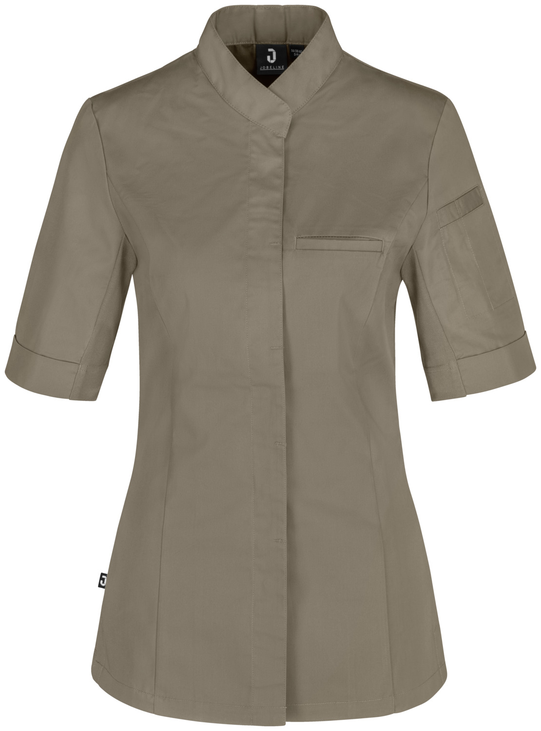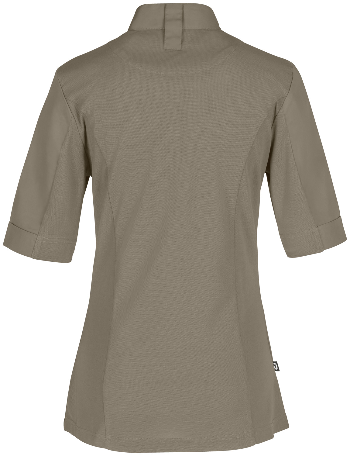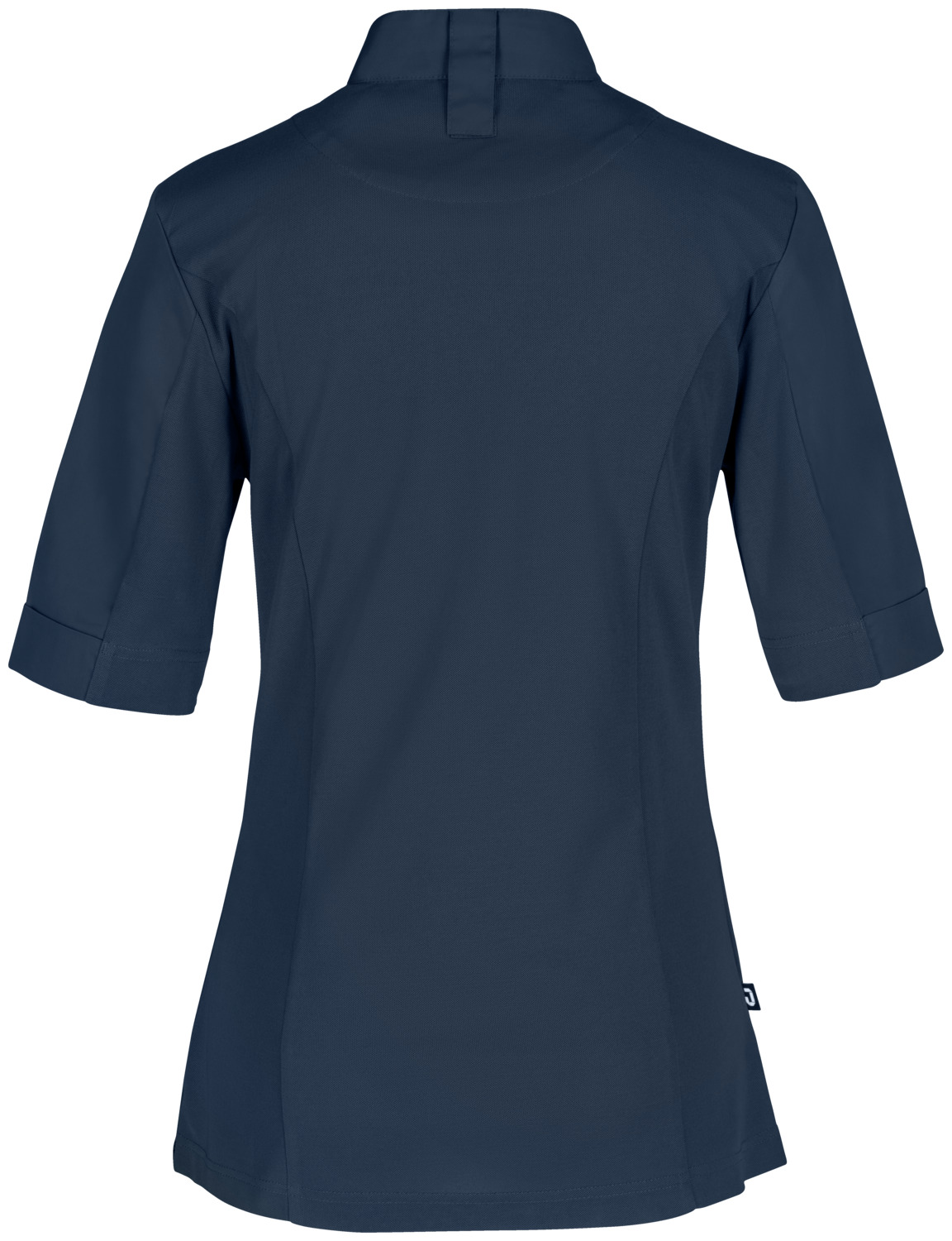 65% πολυεστέρας, 35% βαμβάκι. 150 g/m². Πλύσιμο στους 60°C Κομψό γυναικείο σακάκι σεφ με κοντά μανίκια, από πολύ ελαφρύ και διαπνέον ύφασμα. Με ανασηκωμένο γιακά και κρυφή τρέσα με κουμπιά, καθώς και τσέπη 2 τμημάτων στο πάνω μέρος του βραχίονα. Με χωνευτή τσέπη στο στήθος και πρακτική θηλιά για ποδιά στο λαιμό. Ολόκληρη η πλάτη και το κάτω μέρος των μανικιών είναι κατασκευασμένα από ελαστικό διαπνέον ύφασμα πικέ, το οποίο εξασφαλίζει σωστή και εξαιρετικά άνετη εφαρμογή. Ελαφρώς μεσάτο κόψιμο. Μήκος πλάτης: 68 εκ. (μέγεθος 36)