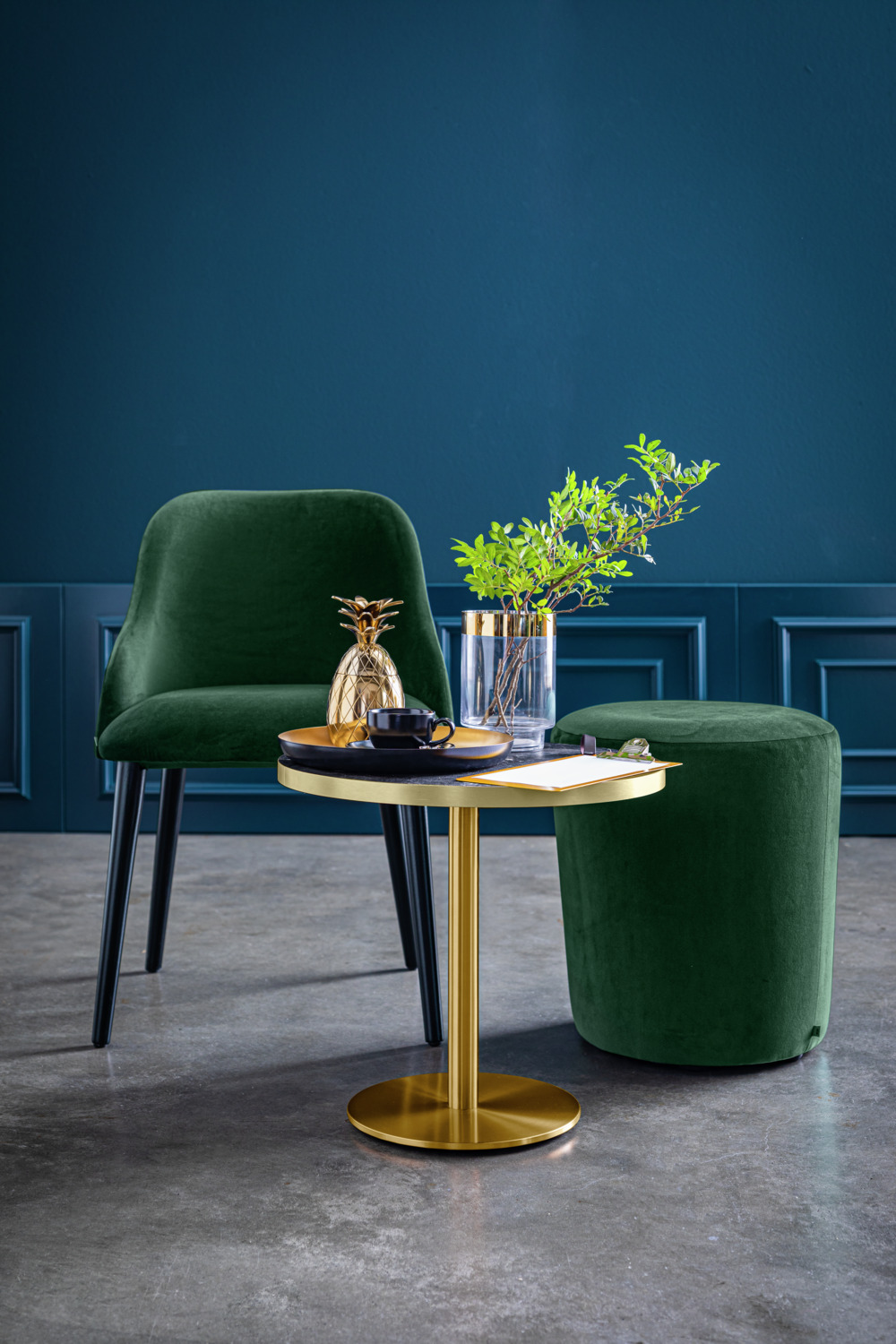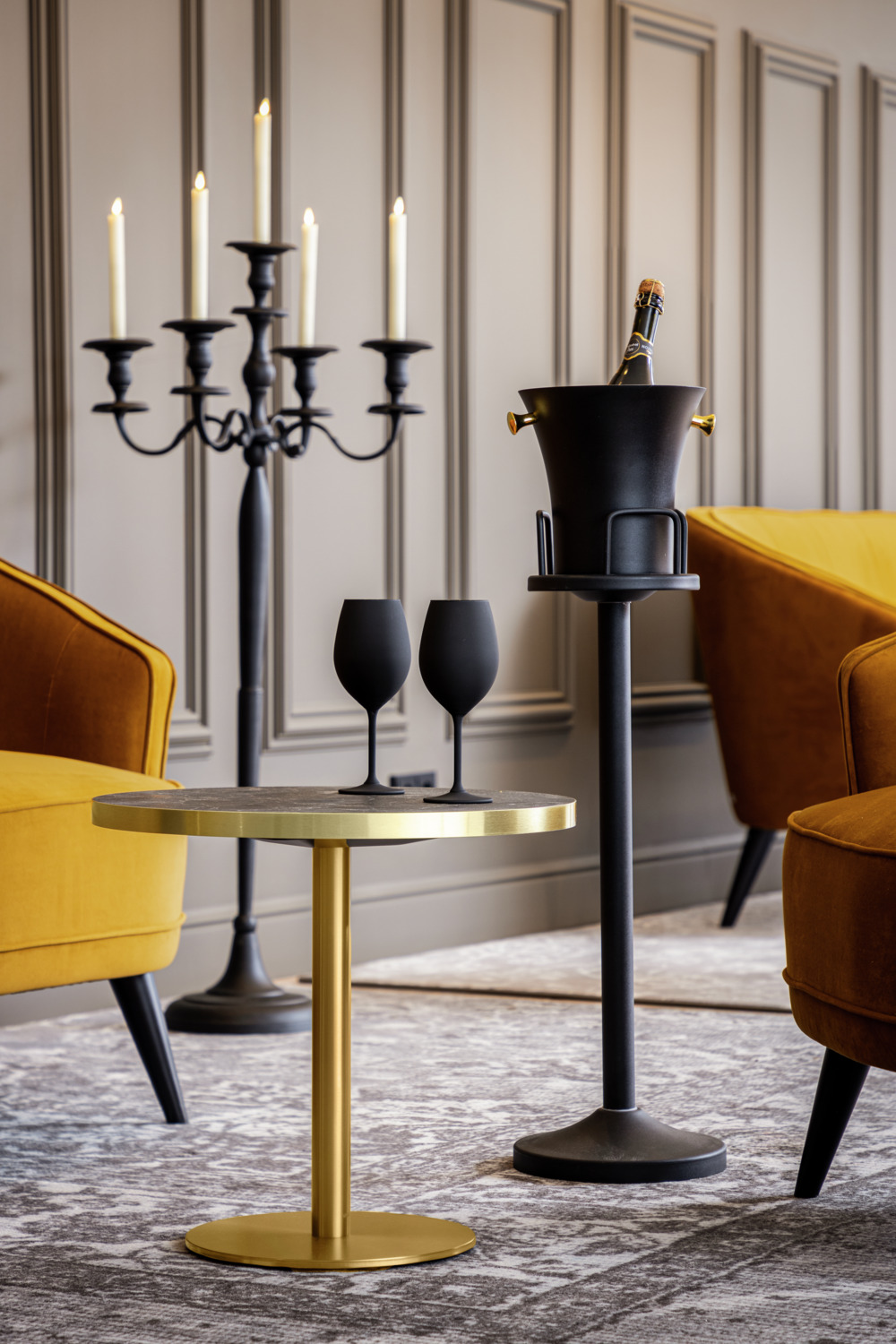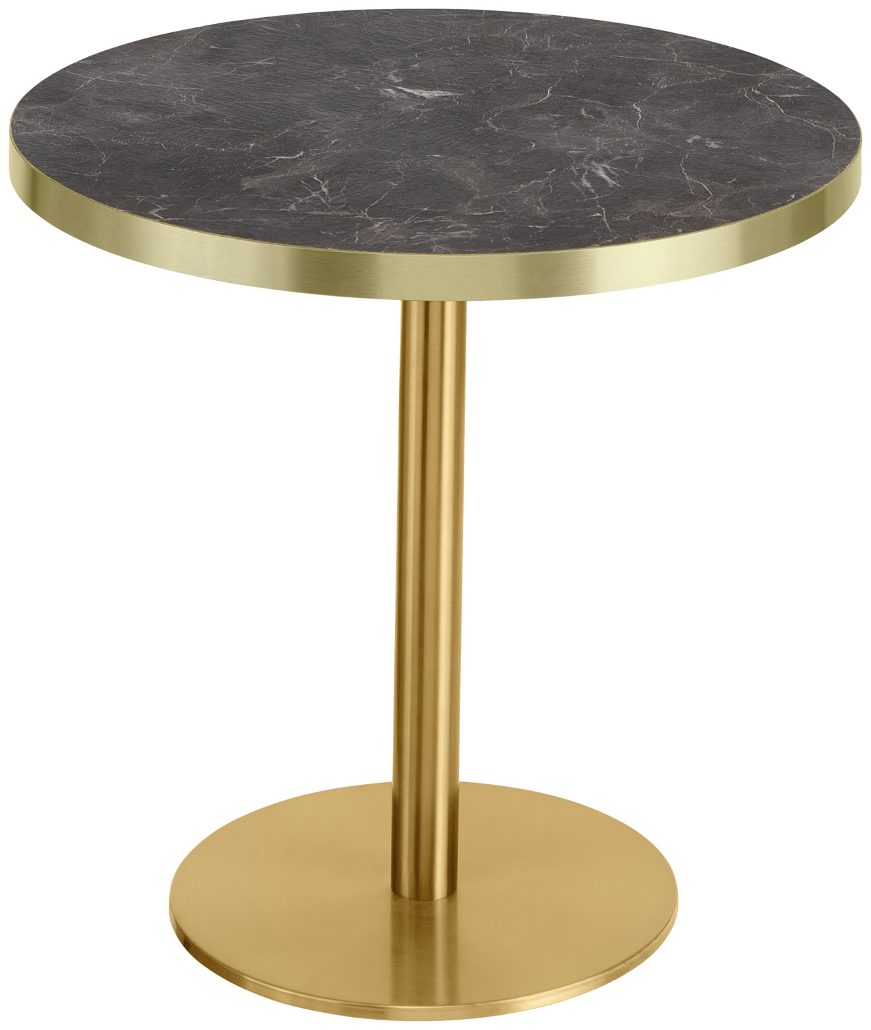 Βοηθητικό τραπέζι με βάση από ανοξείδωτο ατσάλι, με χρυσή λάκα. Επιφάνεια τραπεζιού σε μαρμάρινη όψη με χρυσές βουρτσισμένες άκρες αλουμινίου (2 χιλ.). Παραδίδεται αποσυναρμολογημένο, συμπεριλαμβανομένου του υλικού τοποθέτησης με τη βάση του τραπεζιού. Κατάλληλο μόνο για χρήση σε εσωτερικούς χώρους.