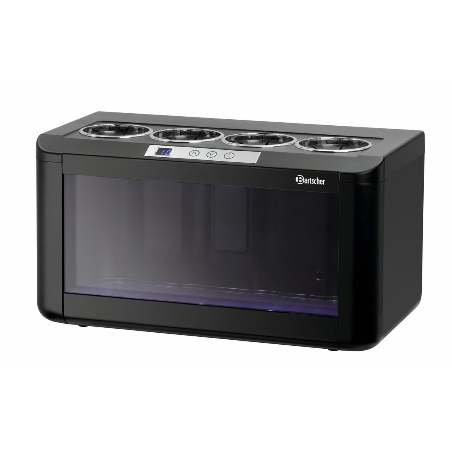 Ψυγείο κρασιού εξοικονόμησης χώρου με ξεχωριστά ενεργοποιούμενο φωτισμό LED σε κομψό σχεδιασμό από πλαστικό. 4 φιάλες λευκού, ροζέ ή κόκκινου κρασιού μπορούν να διατηρηθούν αντιπροσωπευτικά δροσερές σε μία ζώνη θερμοκρασίας. Άνοιγμα μπουκαλιών Ø 9 cm. Θερμοηλεκτρική ψύξη ρυθμιζόμενη από 5°C έως 18°C.